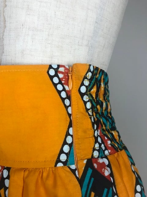 マキシ丈が旬!アフリカ柄で存在感バッチリの人気のスカートです。ハイウエスト仕様で美脚効果バツグンです。マキシ丈ですがAラインにすることで裾の動きが出やすく、長さがあるのに重たく見えない絶妙なシルエットになります。さらにウエスト一部をゴム仕様にし、ジップも横に配置することでフロントから見た時のウエストの印象をすっきりと仕上げました。デザインが活きるよう、タックインするのがオススメ。